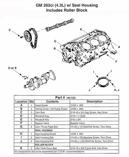 Small parts hardware kit. Engines with 1pc. rear main seal and no balance shaft.