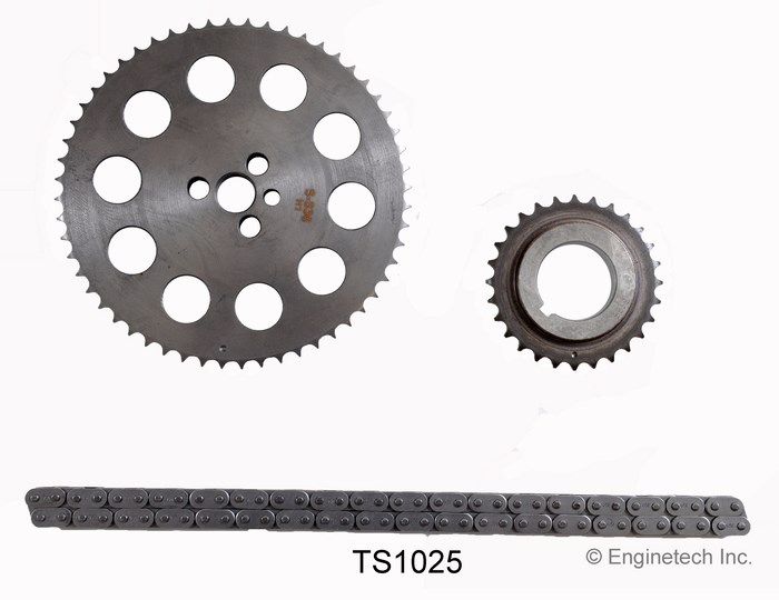 Engine VIN code W,X. Safari, Sierra & Silverado. 3pc. set. Single roller chain. Cam sprocket has (3) bolt holes and no humps on sprocket face.