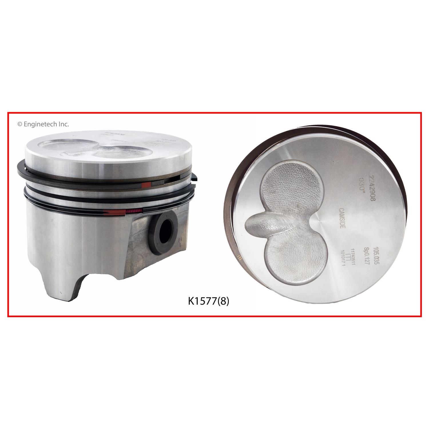 1.940" CH. Destroked .010". Ex. turbo. Iron top ring groove. 1.110" pin diameter. Kit contains (8) pistons with premium rings not loaded on pistons.