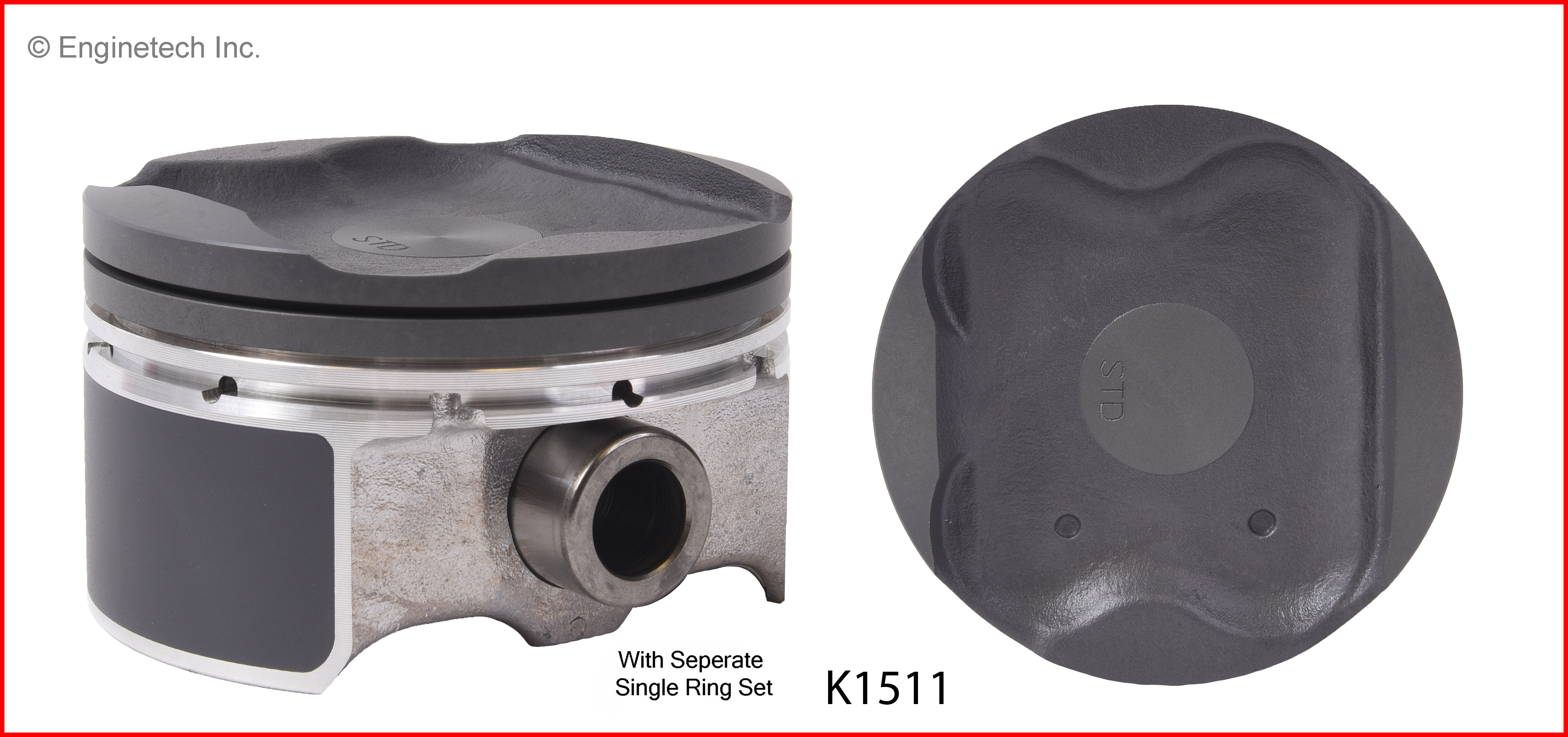Press fit pin. Dish top. Coated skirt. Kit contains (4) pistons with premium M30704 rings not loaded on piston.