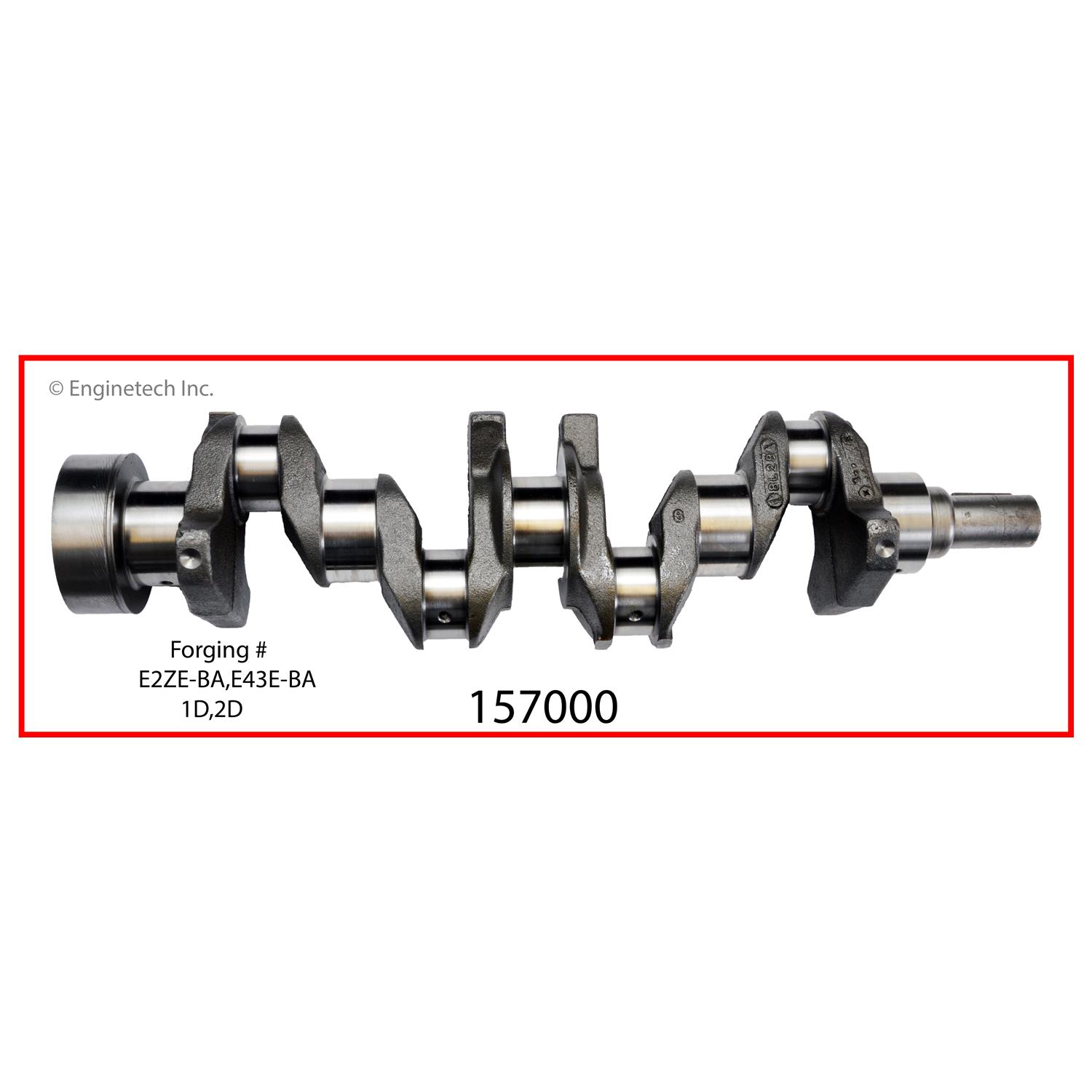 Engines with single plug heads. 2.399" main journals. Includes bearings. Forging # E2ZE-BA, E43E-AC, 1D, 2D. Check for proper physical match before installation.
