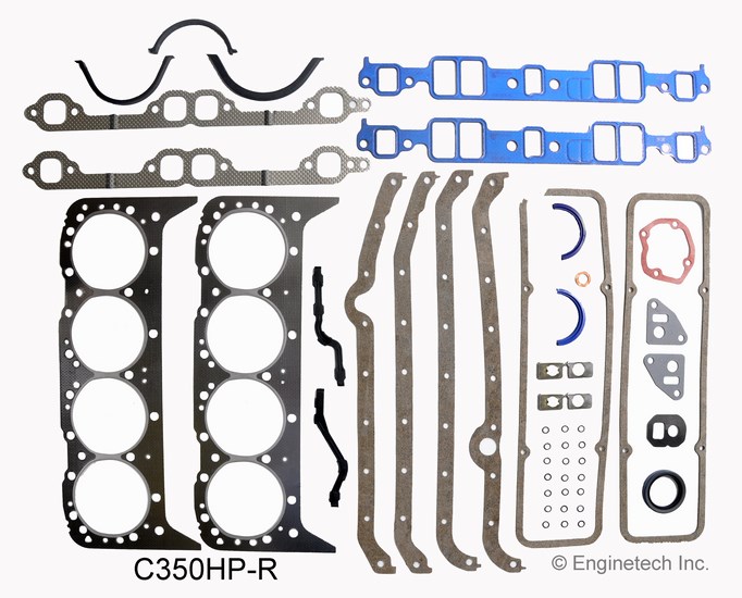 High performance. Graphite and stainless steel head gaskets. H.D. five layer intake gaskets. Fits engines from 1975 with 2pc. rear main seal (except '82-85 Corvette). One piece oil pan gasket for Right dipstick.