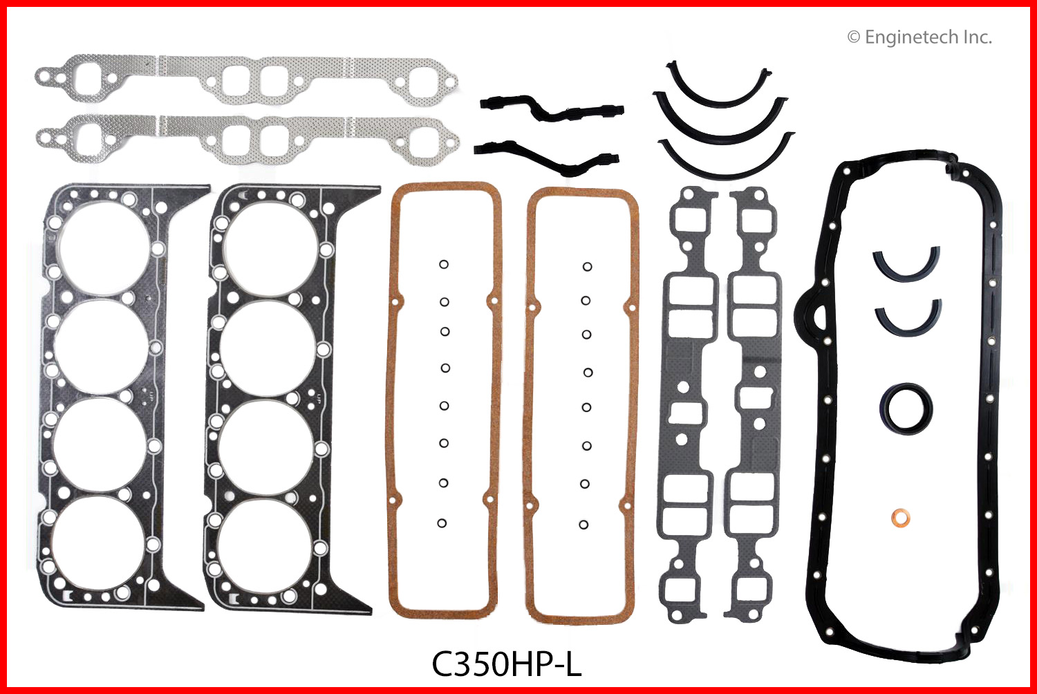 High performance. Graphite and stainless steel head gaskets. H.D. five layer intake gaskets. Fits engines from 1975 with 2pc. rear main seal (except '82-85 Corvette. One piece oil pan gasket for Left dipstick.