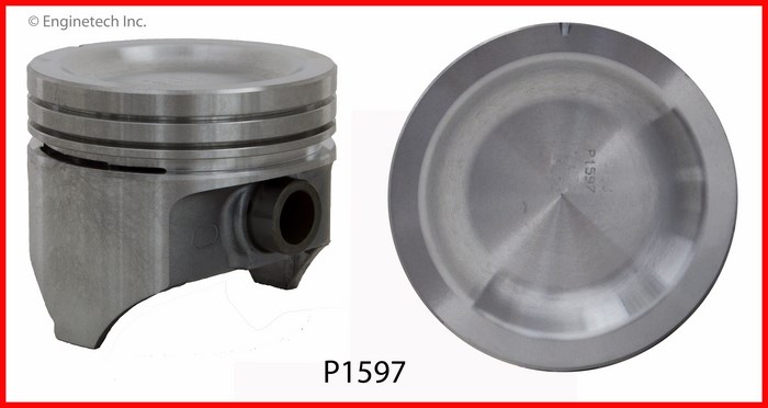 Round dish top. 1.767 compression height. 7.8:1 Compression ratio. Hypereutectic Use R40056 or M40056 rings.