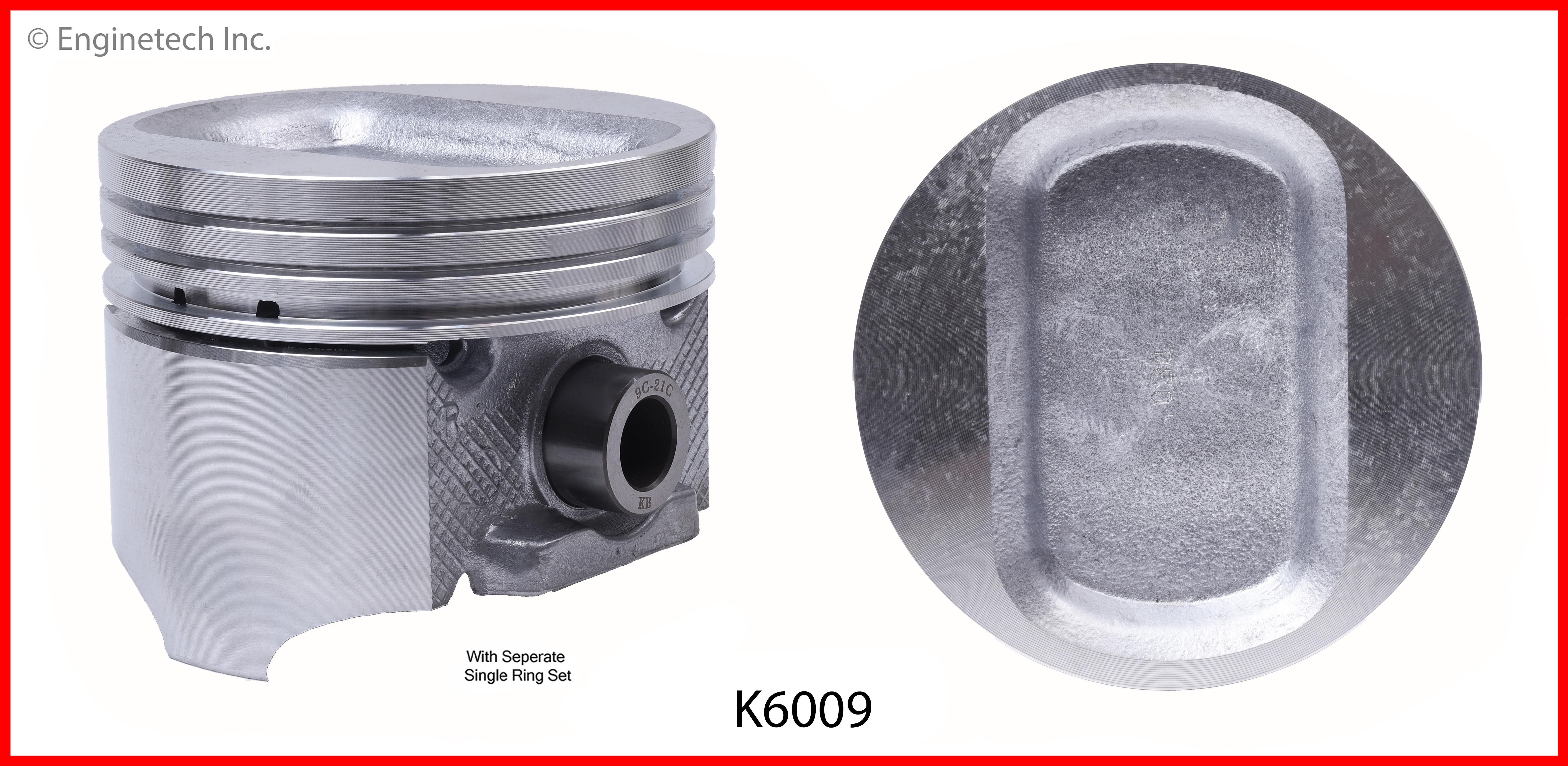 Rectangular dish top. 8.5:1 compression ratio. Kit contains (8) pistons with R43058 rings not loaded on piston.