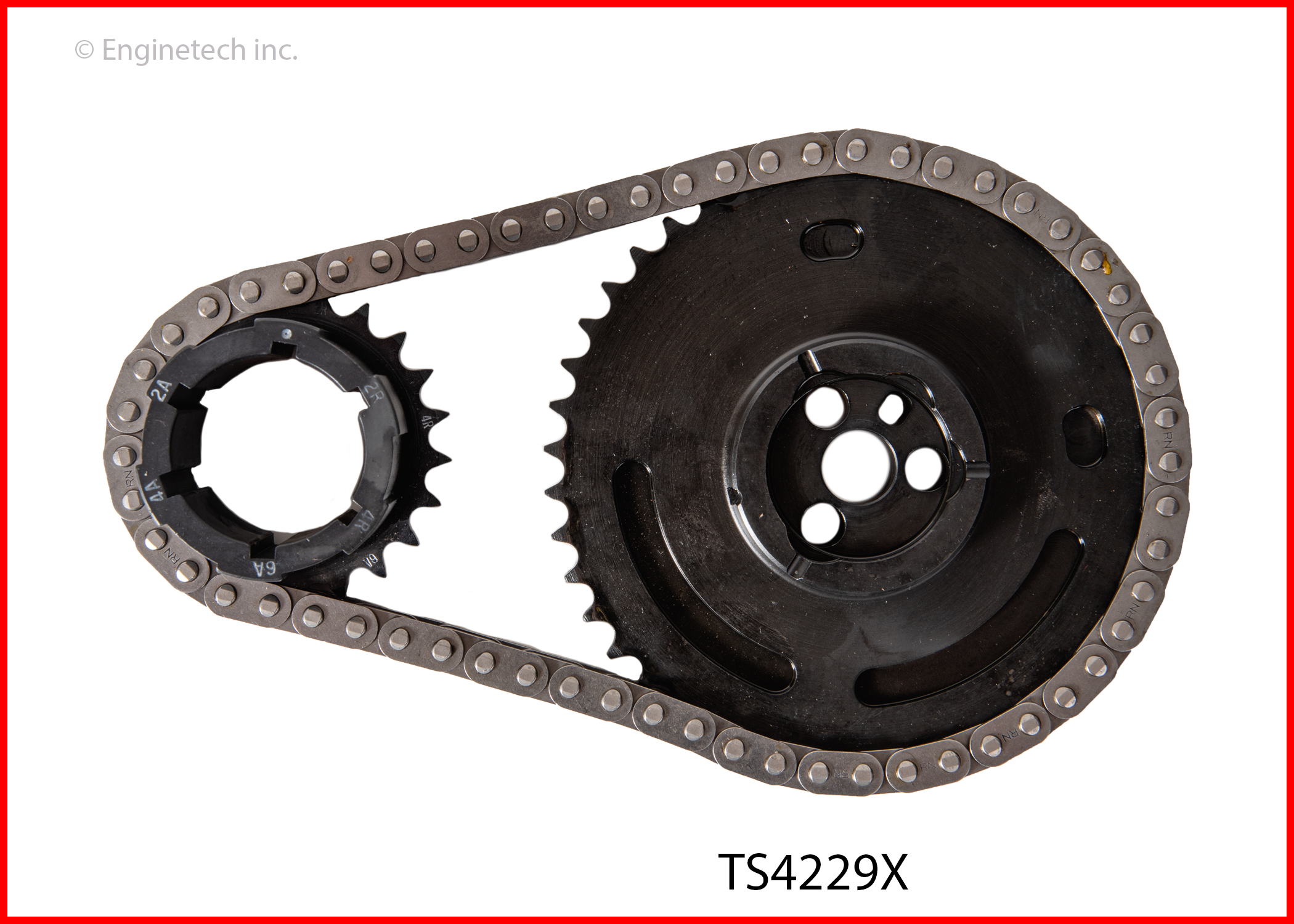 3pc. set. Cam sprocket has (3) bolt holes and (4) humps on sprocket face. 6 position crank sprocket. For 54 tooth reluctor wheel and blocks with cam sensor in timing cover. Forged billet, induction hardened and manganese phosphate coated sprockets.